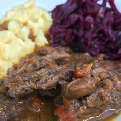 Dazu passen ganz hervorragend Rotkraut und Spätzle oder Kartoffelpüree.