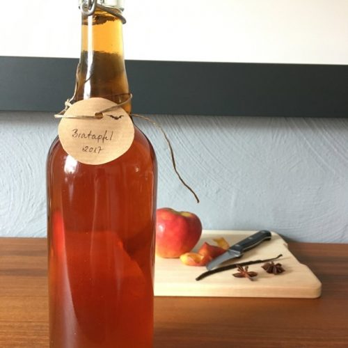 • Alle Zutaten vermischen und in ein Glas füllen. Die Äpfel müssen bedeckt sein. 4 Wochen ziehen lassen. Dann in Flaschen abfüllen.