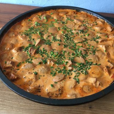 – Du hast vom Grillen noch Bratwürste übrig? Dann mach doch Gulasch draus. Das lässt sich übrigens gut einfrieren.