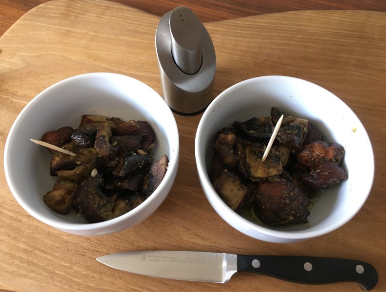 - Fett und Butter in einer Pfanne erhitzen, Zwiebelwürfel darin glasig dünsten. Tomatenmark mit anrösten. Knoblauch, Tomaten und Pilze mit in die Pfanne geben und anbraten. Mit dem Marsala ablöschen. Ca. 5 Minuten köcheln lassen.