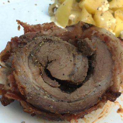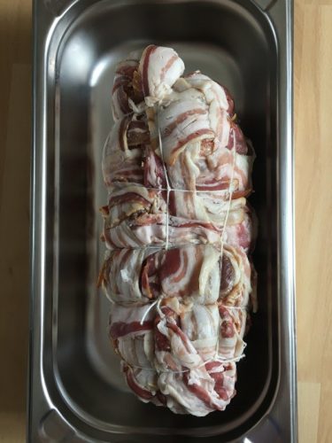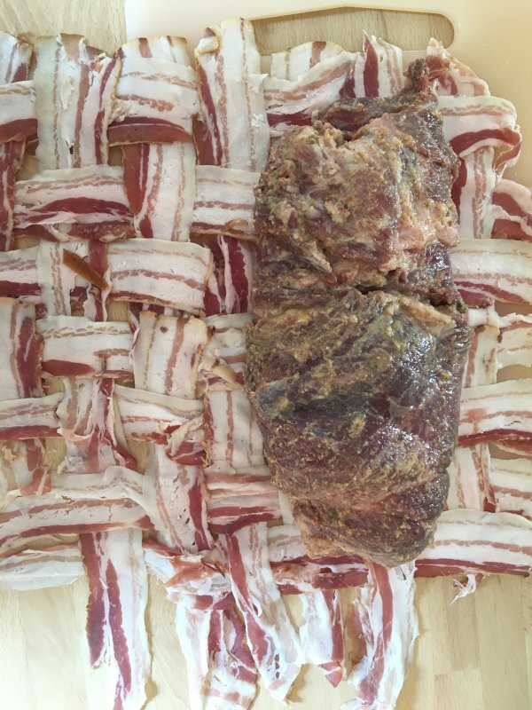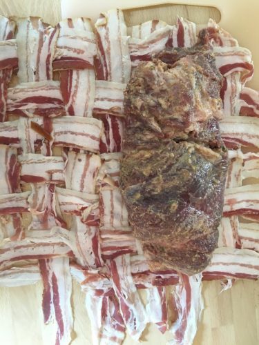 • Aus dem Bacon ein Netz flechten, den Rücken mittig platzieren und eng einwickeln.