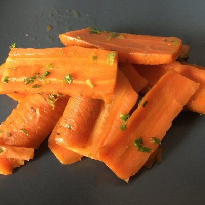 • Möhren in Stife oder Scheiben in gewünschter Größe schneiden, zusammen mit dem Salz und einem Esslöffel Butter in eine Pfanne geben, 150 ml Wasser zugeben und solange offen köcheln lassen, bis die Flüssigkeit nahezu verdampft ist und die Möhren bissfest sind.