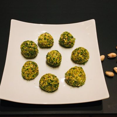 • Mit 2 Teelöffeln Käsemasse abstechen, in den Pistazien und der Petersilie wälzen und Kugeln daraus formen. Macht die Kugeln nicht zu groß, denn durch den Käse sind sie recht mächtig.