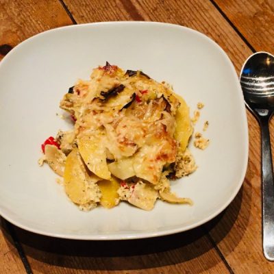 • Gewürze mit Schmand, Sojasauce und den Eiern verquirlen, die Mischung über Kartoffeln/Zwiebeln geben und unterrühren.