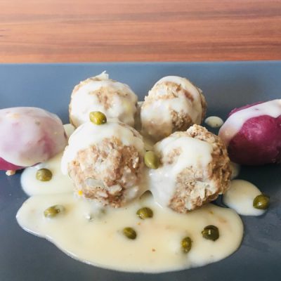 • Kapern und Klöße dazugeben und noch einige Minuten in der Soße ziehen lassen.