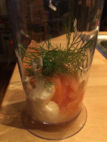 • 250 g Räucherlachs in Scheiben, mit der Gabel zerpflückt