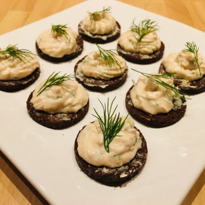 • Die Pumpernickel-Taler mit der weichen Butter bestreichen, die Lachsmasse mit dem Spritzbeutel auf die Taler geben, mit dem restlichen Dill garnieren.