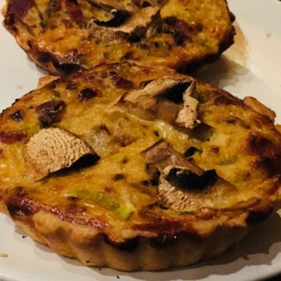 • Sahne mit den Eiern verquirlen, Käse unterrühren, in die Pfanne geben und unterheben. Mit den Gewürzen abschmecken. Die Masse auf den Teig in den Förmchen geben, die geschnittenen Pilze darauf geben.
