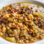 - Butter erhitzen und Speck darin auslassen. Zwiebeln ca. 2-3 Minuten mitbraten. Linsen, Kartoffeln und Brühe dazugeben und zugedeckt ca. 20 Minuten köcheln.