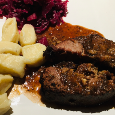• Die Keule vom Küchengarn und den Zahnstochern befreien, aufschneiden und nach Belieben mit Rotkraut, Knödeln/ Gnocchies/ Spätzle etc. servieren