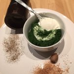 • Eine großzügige Flocke Butter in einem großen Topf oder Wok erhitzen und Zwiebeln und Knoblauch darin glasig dünsten. Nach und nach den Blattspinat hinzugeben und zerfallen lassen.