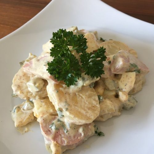 • Kartoffeln und Lyoner in Scheiben schneiden, hartgekochte Eier in grobe Stücke schneiden.