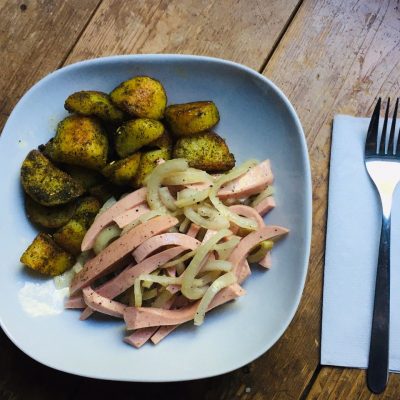 • Aus den restlichen Zutaten (außer der Petersilie) eine Marinade anrühren. Lyoner und Ziebeln mit der Marinade begießen und ca. 1 Stunde ziehen lassen.