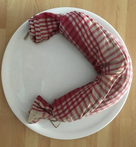 - Aus der Masse eine Rolle formen mit einem Durchmesser von ca. 6 – 8 cm und in ein Küchentuch oder Leintuch einwickeln. Die Enden zubinden und mindestens 3 Stunden (oder über Nacht) im Kühlschrank ruhen lassen.