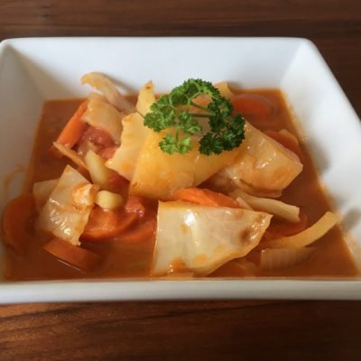 - Vom Weißkohl die äußeren Blätter entfernen und den Strunk herausschneiden. Den Kohlkopf vierteln und in mundgerechte Stücke schneiden. Kartoffeln schälen, Kartoffeln und Möhren in schräge Stücke schneiden.